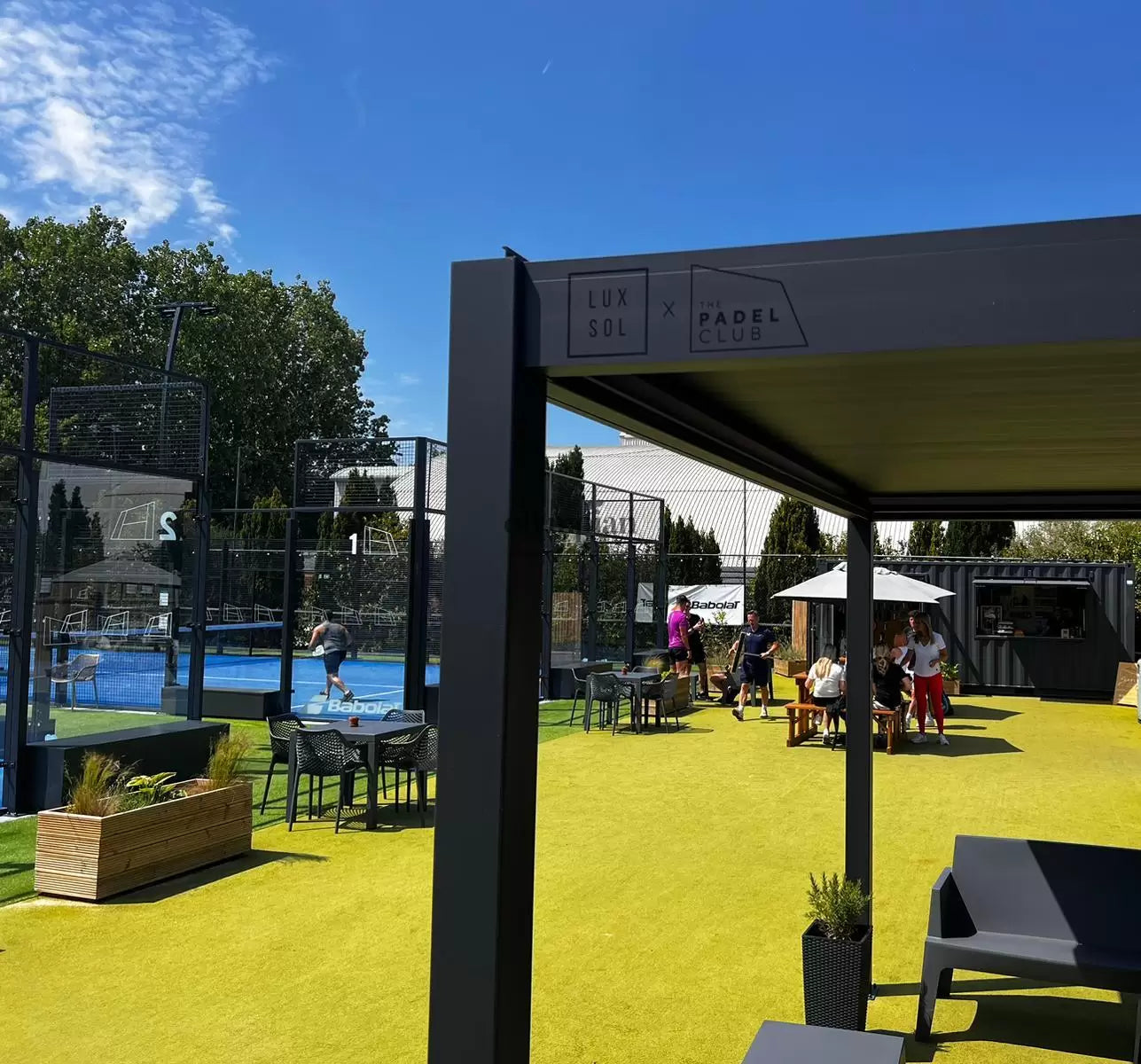 As part of our partnership, two LuxSol Como and one LuxSol Aura aluminium pergolas, each measuring 4m x 3m have been carefully selected and installed at the club. These pergolas provide versatile outdoor spaces for our players. The LuxSol Pergolas offer the perfect solution, whether seeking shade, rain protection, or a comfortable area to socialise.